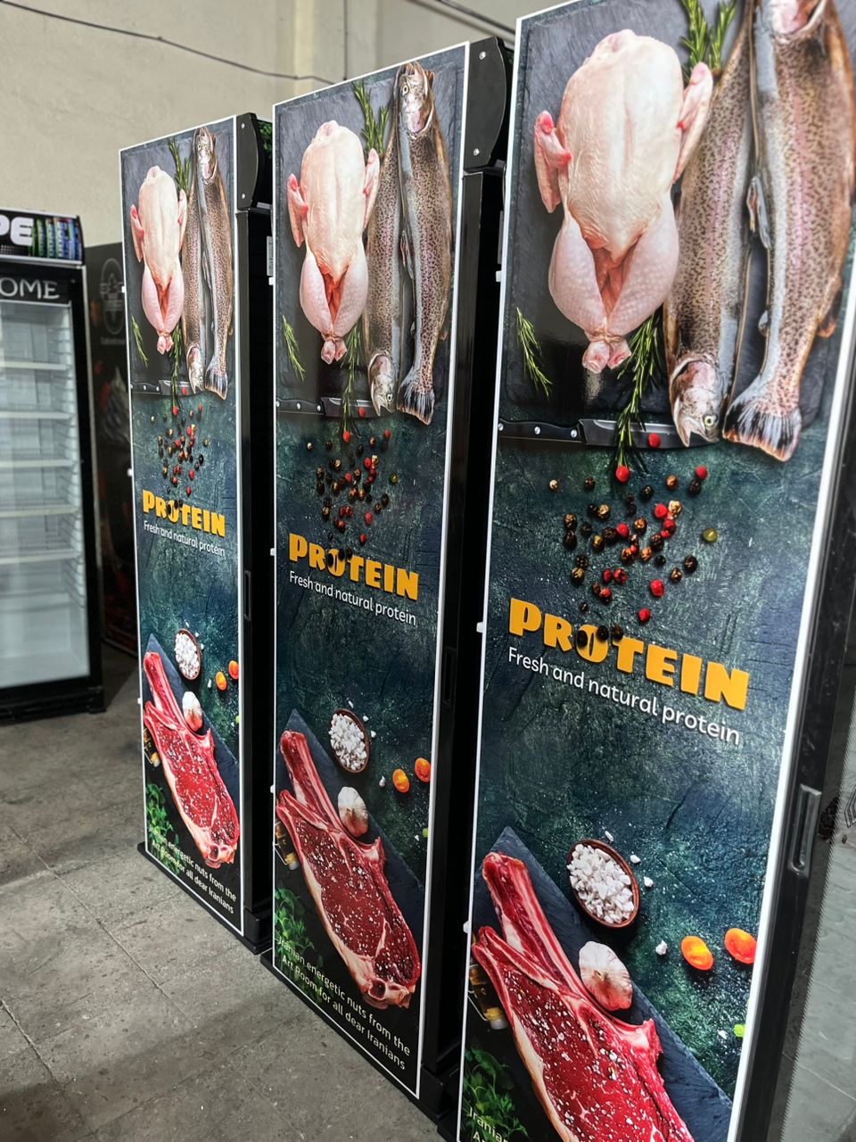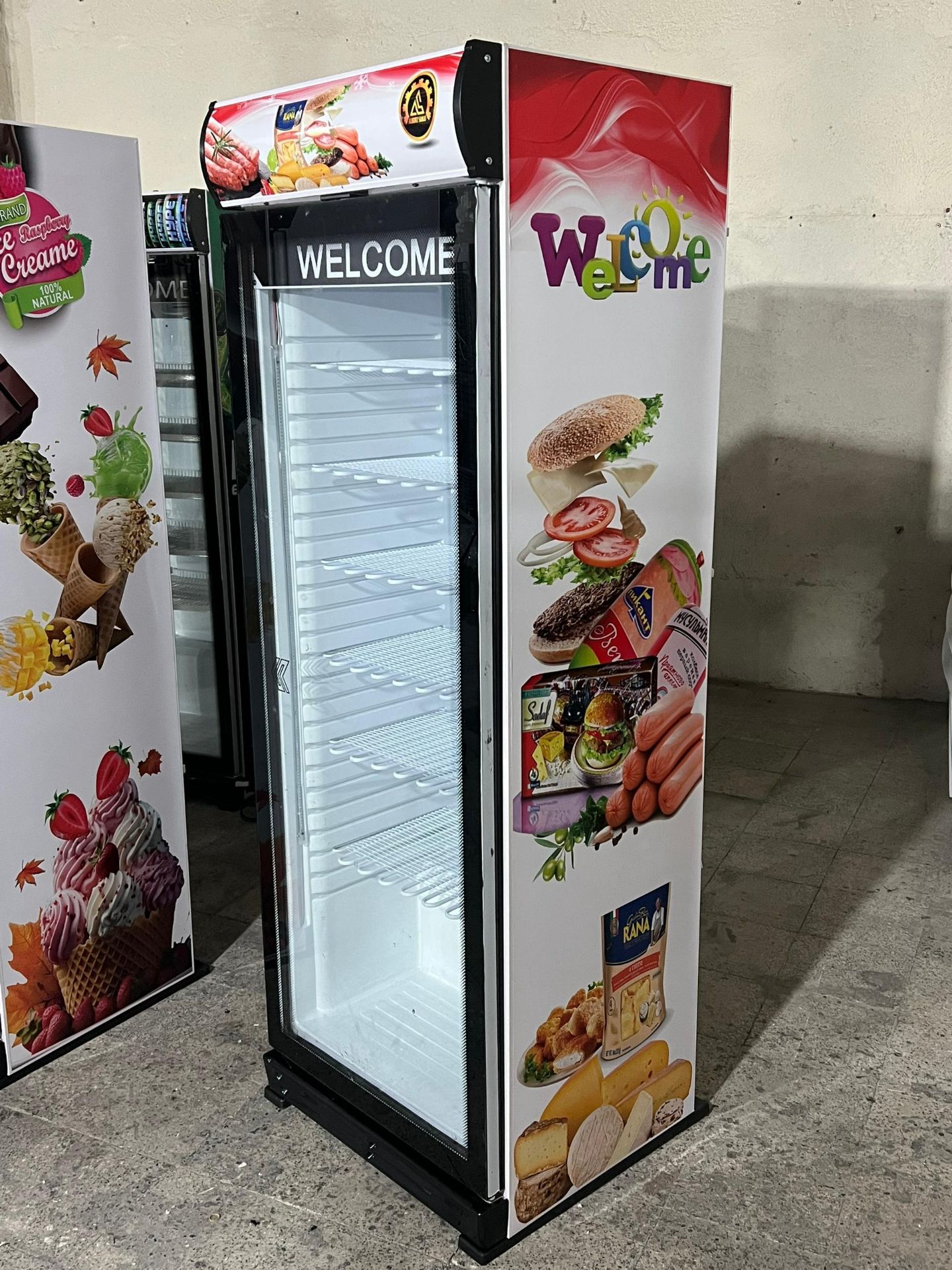 فریزر بستنی ایستاده ویترینی عرض 70 سانت تک درب طرح پروتئین و فست فود